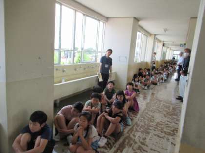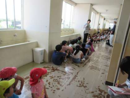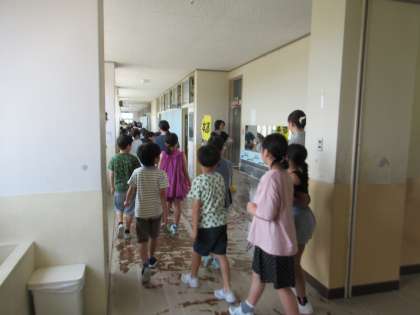 今日は大雨、洪水が起きたときの避難訓練でした。朝日保育所と合同で訓練を行い、落ち着いて校舎の3階まで避難しました。