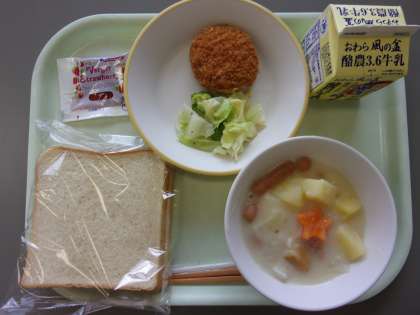 今日の給食は、牛乳、パン、イチゴジャム、メンチカツ、サラダ、シチューでした。