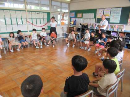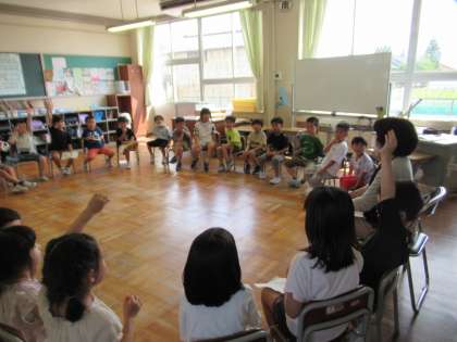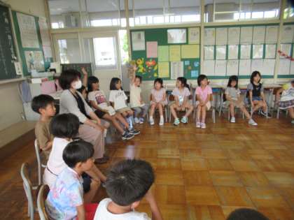 7月3日(月)1・2年生 ホクリクサンショウウオとのお別れ会 公開日 2023/07/03 更新日 2023/07/03 1年生 5月から1、2年生で育ててきたたホクリクサンショウウオを、ファミリーパークへお返しする日になりました。ファミリーパークの職員の方をお招きして、感謝の気持ちを伝えたり、ホクリクサンショウウオ等生き物についての質問をしたりしました。