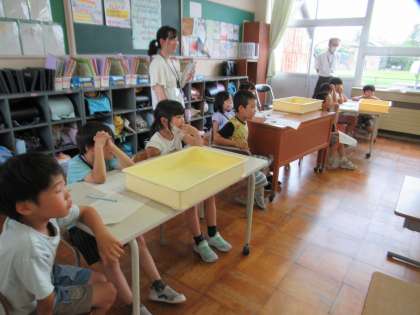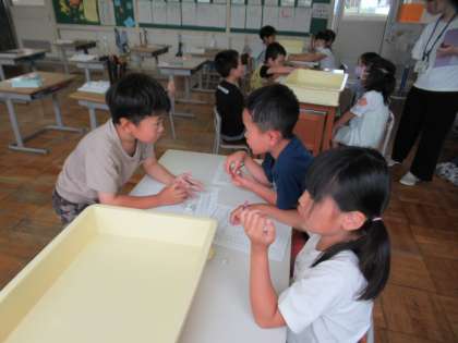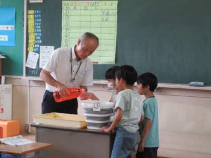 7月5日(水)2年生 算数の学習 公開日 2023/07/06 更新日 2023/07/06 2年生 先日学習した「dL」という単位を使って、いろいろな容器の水の量を量りました。 「7dLじゃない?」 「いやちがうよ、もっと入りそうだよ」 「3Lだから、30dLかな」 計測する前にどのくらいの量が入るのか予想しながら、班に分かれて学習をしました。