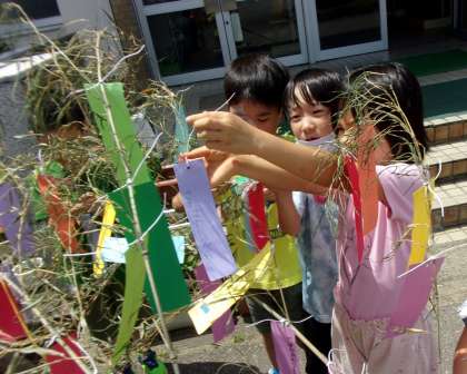 今日は七夕。今朝の1年生の聴き合いは七夕トークでした。「織り姫と彦星が会えたら願いを叶えてくれるんだよ」「じゃあ、会えなかったら」「鳥さんが橋をつくってくれるから大丈夫だよ」「僕の願い事は、走るのが速くなりますように」など、思いを語り合い、星に届くように「たなばたさま」を歌いました。一人の子供が「ぼくたちの入学式が4月7日だったからちょうど3か月経ったんだね」と話し、みんなでうなずきました。