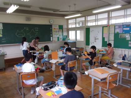 家庭科の学習では、1学期で身に付けた力を生かし、フェルトを使ってマスコットを作っています。自分が表したいものに合う色や形を決めて、布を裁断したり縫い方の見通しをもったりしました。困ったときには友達と相談し、協力して活動を進めました。