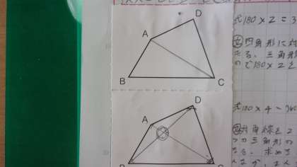 四角形の内角の和についての学習です。既習の内容を生かしながら、求め方を考えました。