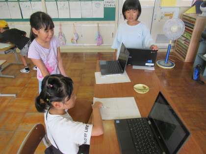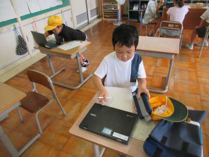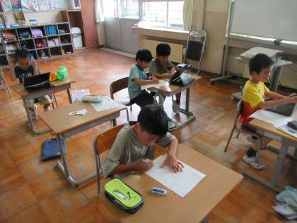 2年生は生活科の時間に、身の回りにいる生き物を捕まえて観察しています。バッタ、カナヘビの他、この日は、緑鮮やかな色で大きな「イラガの幼虫」(昭和時代の富山の大人は「シナンタロウ」「キントキ」と呼ぶ人もいます。)を見つけて教室に持ち込み、熱心に観察しスケッチしました。