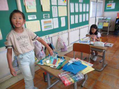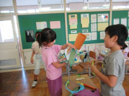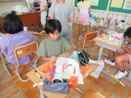 ひとりひとり工夫を凝らして、作品と向き合っています。友達の作品も気になるようで、仲よく見せ合いながら楽しくつくりました。