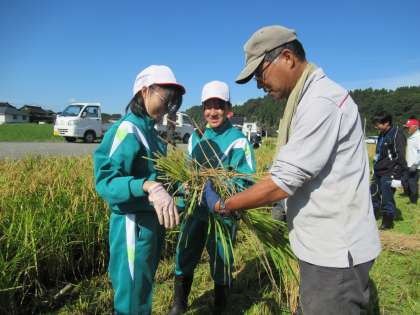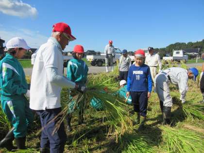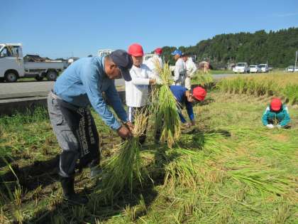 地域の方に教わりながら、稲刈り体験をしました。稲を一つずつ刈る大変さや、刈った稲を束ねる難しさに気付きました。収穫した米は、餅つきをしてみんなに振る舞う予定です。