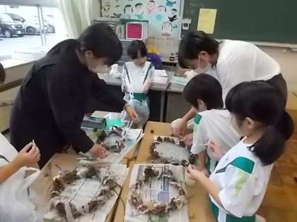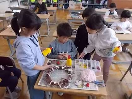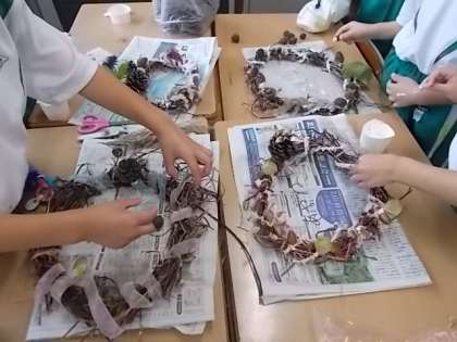 いよいよ、楽しみにしていた飾り付けです。リボンや毛糸を巻き付け、そこに木の実や飾りをボンドで付けていきました。「まつぼっくりが落ちちゃうよ」と言いながらしっかりと手で押さえたり、細かい飾りをそっと挟んだりしていきました。友達と相談し合い、「結び目をつくって」と6年生に頼りながら、イメージ通りのリースに仕上げた子供たち。すてきな秋のリースを大切に見せ合いました。