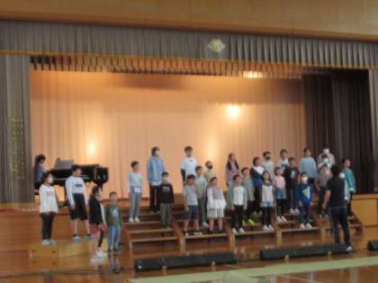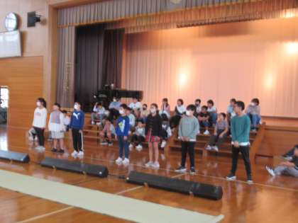 10月10日(火)4・5・6年生 合唱練習 公開日 2023/10/10 更新日 2023/10/10 4年生 今日も体育館のステージで合唱の練習をしました。歌詞の思いを目や口から、メロディーにのせて届けよう、とアドバイスをもらい、心をこめて歌いました。