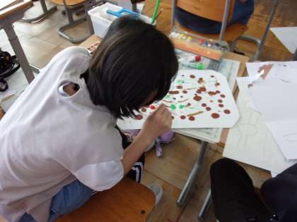 「言葉から形・色」の表現をしています。言葉から思い浮かぶ表現を、筆やストロー、歯ブラシなどを使い、表しました。イメージに近付くように道具を使い、偶然生まれる形を楽しみながら描きました。
