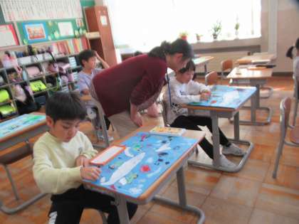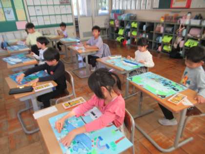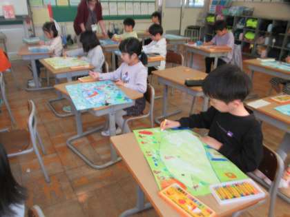 10月18日(水)1年生 図工の学習 公開日 2023/10/18 更新日 2023/10/18 1年生 以前描いたくじらぐもの絵を、さらにパワーアップさせました。友達と見せ合って、いいところを言い合ったり、アドバイスをもらったりして、クレヨンで描き加えました。 「くじらぐもをもっとおいしそうにしたいな」 「もっとふわふわに描きたいな」 と、イメージをふくらませていきました。