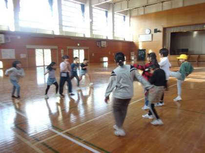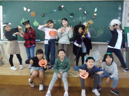 学級活動の時間に、お楽しみ係が企画したハロウィン集会を行いました。折り紙で作ったおばけやかぼちゃ等の飾りと一緒に記念撮影をしたり、宝探しや花いちもんめをしたりして楽しい時間を過ごしました。