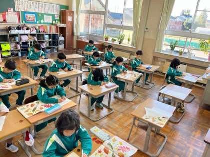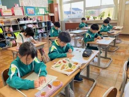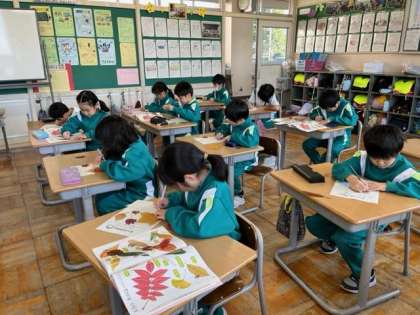 11月1日(水)1年生 生活科の学習 公開日 2023/11/01 更新日 2023/11/01 1年生 秋見つけの学習で、落ち葉の絵を描いています。手元の葉っぱをよく観察しながら、観察カードに描きました。