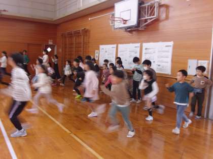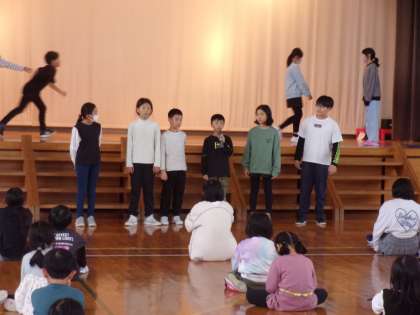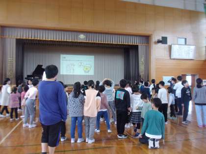 11月8日(木) にっこりハッピー集会 公開日 2023/11/08 更新日 2023/11/08 学校行事 朝日っ子タイムの時間に「にっこりハッピー集会」を行いました。元気もりもり楽しい委員会による食べ物のクイズや、だるまさんの一日をして楽しみました。全校合唱では、体育館中にきれいな歌声をひびかせました。