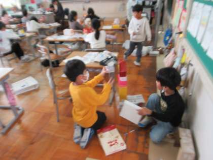 11月15日(水)1年生 図工の学習 公開日 2023/11/15 更新日 2023/11/15 1年生 家から持ってきた箱を使って、どんなものを作ろうか計画を立てています。中には実際に組み立ててみて考える子もいました。丸い箱、四角い箱…どんな物ができあがるか楽しみです。