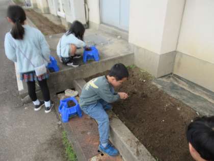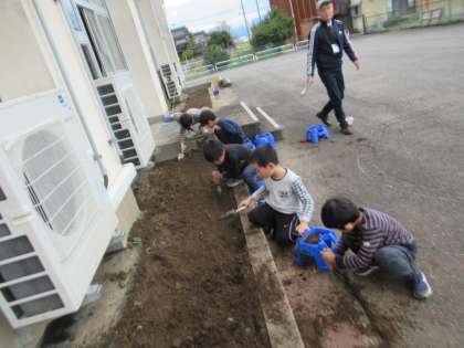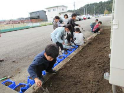 11月15日(水)2年生 球根を植えました 公開日 2023/11/15 更新日 2023/11/15 2年生 教室の外のなかよし広場の花壇へチューリップの球根を植えました。どんな色の花が咲くでしょうか。春が楽しみです。