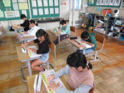 11月15日(水)3年生 国語の学習 公開日 2023/11/15 更新日 2023/11/15 3年生 新しい漢字を学習しています。「1、2、3!」と元気な声で数えながら画数の確認をしたり、リズムよく関連単語を暗唱したりして学習しました。