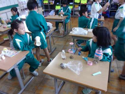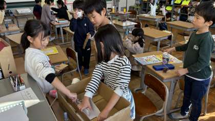 拾ってきた木の実をつかって秋のおもちゃづくりを楽しんでいます。「中のどんぐりの大きさや数によって音が違うよ」と音の違いを確かめながら複数のマラカスをつくったり、「よく回るどんぐりはどれかな」と選びながらどんぐりごまをつくったりしています。今日は、友達と一緒に工夫しながら、松ぼっくり剣玉や段ボール迷路づくりにも夢中になり、みんなでどのように遊ぼうかと会話をはずませました。