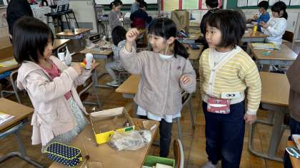 拾ってきた木の実をつかって秋のおもちゃづくりを楽しんでいます。「中のどんぐりの大きさや数によって音が違うよ」と音の違いを確かめながら複数のマラカスをつくったり、「よく回るどんぐりはどれかな」と選びながらどんぐりごまをつくったりしています。今日は、友達と一緒に工夫しながら、松ぼっくり剣玉や段ボール迷路づくりにも夢中になり、みんなでどのように遊ぼうかと会話をはずませました。