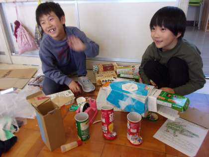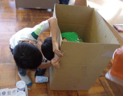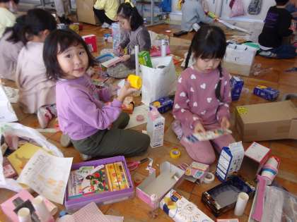 いろいろな形の箱や段ボールを使って、好きな形をつくりました。ウサギやワニ、ハムスター等の動物、家や建物や車等、材料を切ったり貼ったりしながら、イメージした形を思い思いに表していきました。友達と見せ合いながら楽しく製作をしました。