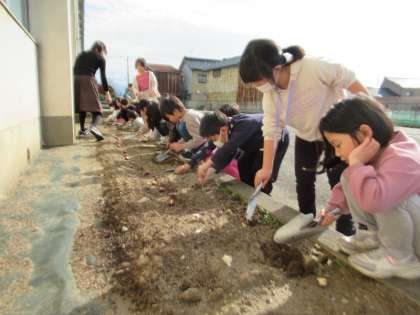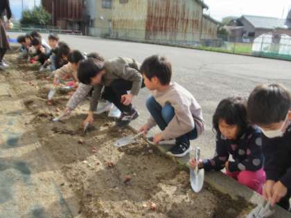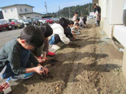なかよし広場の花壇に、チューリップの球根を植えました。何色の花が咲くのか楽しみです。