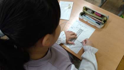 ある点を通り、直線に垂直な直線を引く学習をしました。三角定規をどのように使ったらよいか考え、丁寧に描くことができました。