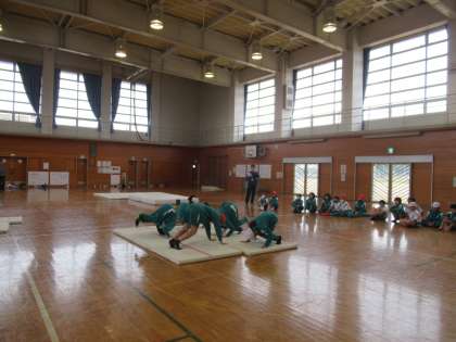 5、6年生でグループをつくり、これまでの学習で練習してきた技を発表しました。これまでの練習では、できなかった技を何度も練習したり、友達にこつを聞いたりして、新しい技に挑戦してきました。また、できる技をより美しく見せるために、友達とタイミングを合わせたり、向きを変えたり、マットの並べ方を変えたりするなどの工夫をしました。グループのよさがよく表れている発表になりました。