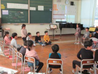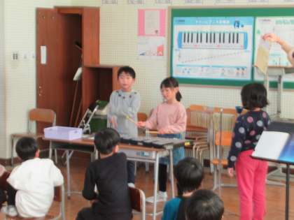 12月6日(水)1年生 音楽の学習 公開日 2023/12/06 更新日 2023/12/06 1年生 物語に合う音楽づくりをしています。今日はグループの演奏の発表を聞いて、工夫していたところやアドバイスなど話し合いました。