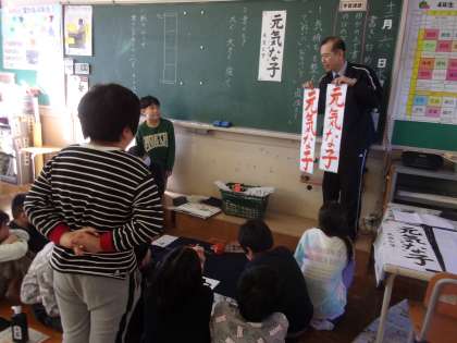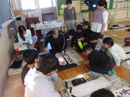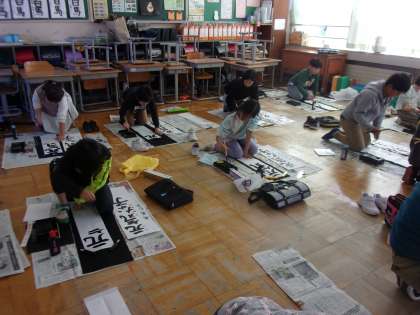 12月6日(水)4年生 書き初め練習 公開日 2023/12/06 更新日 2023/12/06 4年生 半紙に「大きく、太く、力強く書く」という前回の練習を生かしながら、今日は床に本番と同じ書初用紙を広げて書きました。全体のバランスや文字の太さを意識して書いています。
