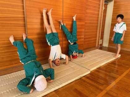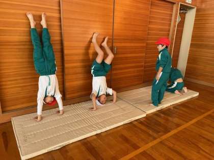 マット運動に取り組んでいます。後転や壁倒立、倒立前転など、それぞれ目当てをもって練習をしました。