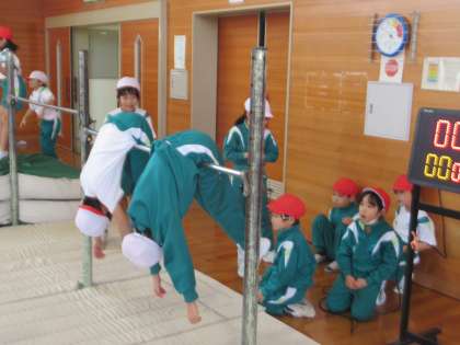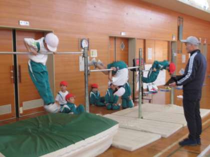 今日は鉄棒に取り組みました。布団干し、ぶたの丸焼きや地球周りなど、様々な技に挑戦しました。
