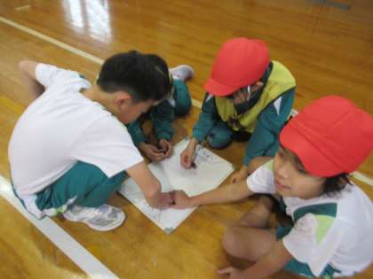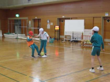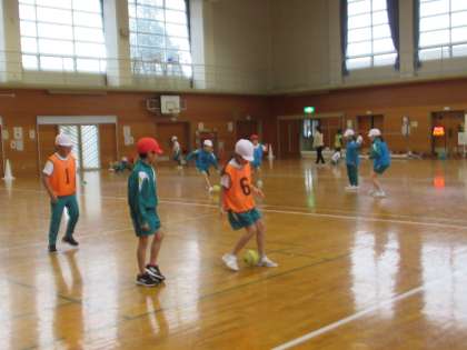 サッカーに取り組んでいます。今日はグループごとに作戦を考えたり、その作戦に向けてパス練習をしたりしました。