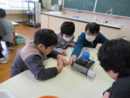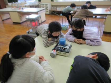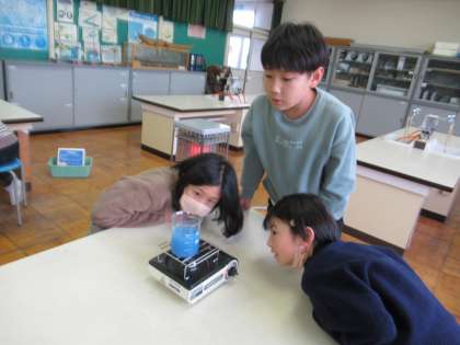 12月18日(月)4年生 理科の学習 公開日 2023/12/18 更新日 2023/12/18 4年生 水はどのように温まるのか、実験をしました。サーモインクを用いて、水の色の変化で温度の変化を確認します。前回は空気の温まり方を学習した4年生は、 「空気と違って、下から温まっていくんじゃないかな」 「熱しているところから全体的に広がっていくと思う」 と、それぞれ予想をしてから実験を行いました。