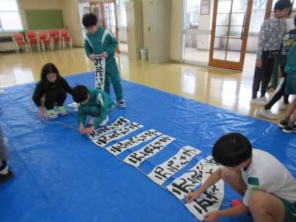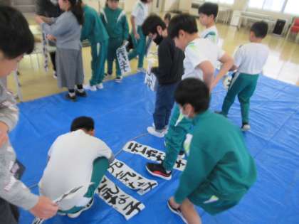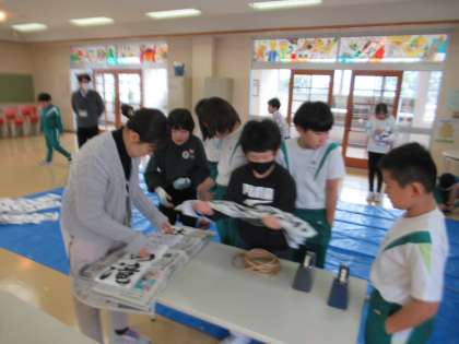 明日の左義長に向けて、冬休み中に練習した習字作品を縄に取り付けて準備をしています。保護者の方々も、ぜひ書き初めや注連飾りなどをお持ちになって、明日の左義長へお越しください。