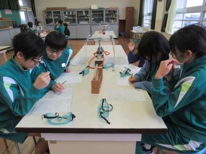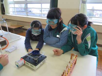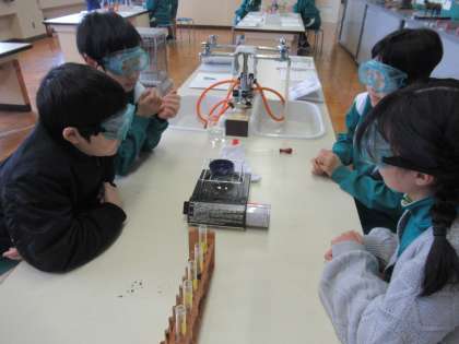 食塩水、石灰水、うすいアンモニア水、うすい塩酸、炭酸水の、5つの水溶液はどのような違いがあるのか、見た目やにおい、蒸発させたときの様子を比べました。薬品や実験器具の扱い方等に気を付けて、実験することができました。