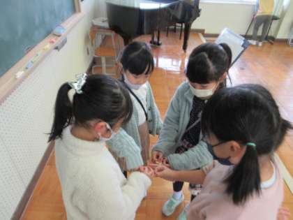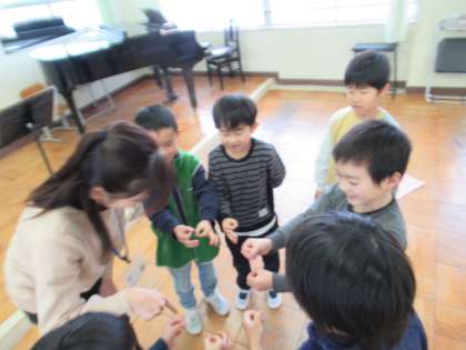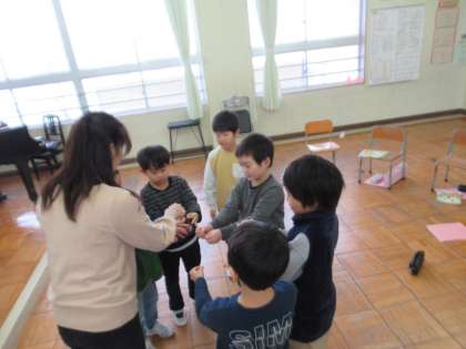 わらべうたの学習です。今日は、グループにわかれて、ずいずいずっころばしをして遊びました。おに役の先生につかまって、うれしそうにはしゃいでいました。