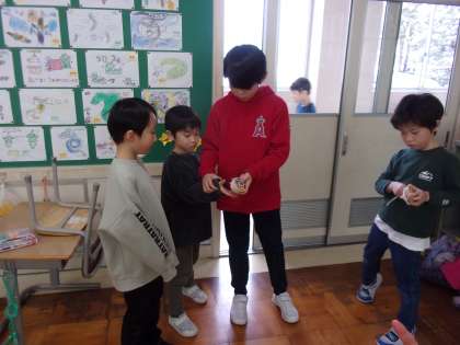 生活科の学習で、昔からの遊びを楽しんでいます。自分がデザインした木ごまにひもを巻いて、回す練習をしています。初めてのこま回しは難しく、「ひもの巻き方が分からない」「どうやって飛ばすの?」と苦戦中ですが、2年生や3年生に教えてもらいながら何度も挑戦しています。