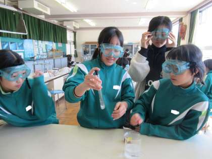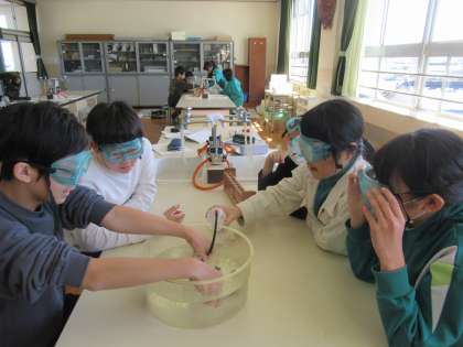 炭酸水には何が溶けているかを予想し、炭酸水から出る泡を調べました。グループで実験の手順を確かめ合いながら、協力して実験をすることができました。