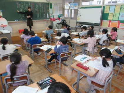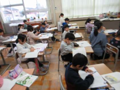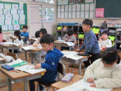 1月22日(月)1年生 国語の学習 公開日 2024/01/22 更新日 2024/01/22 1年生 「たぬきの糸車」という物語を読んでいます。登場人物のおかみさんとたぬきの出会いについて、本文を読んで確認しています。