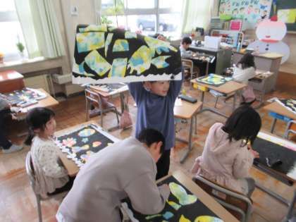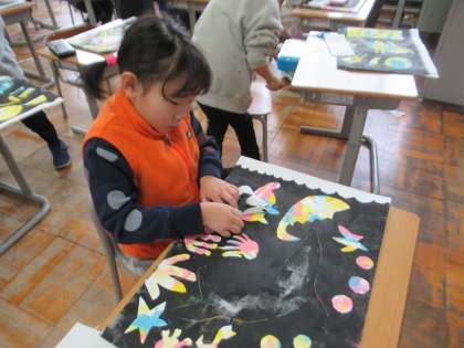 1月24日(水)1年生 図工の学習 公開日 2024/01/24 更新日 2024/01/24 1年生 シールをはがすと、カラフルな模様がでてきました。色鮮やかな作品に仕上がり、子ども達も「みてみて!」と嬉しそうにしていました。作品の題名を書いて、シール版画がいよいよ完成です。