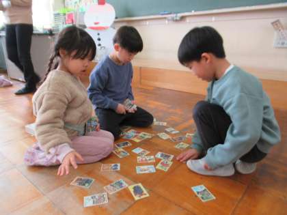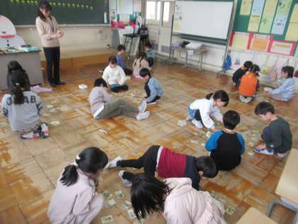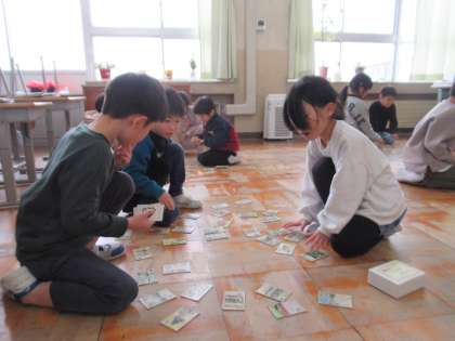 かるた大会の学年の代表を決める予選を行いました。札を取って、一喜一憂する子供たち。1枚でも多くの札をとれるようがんばっています。