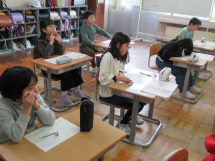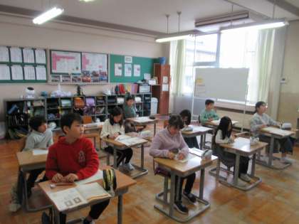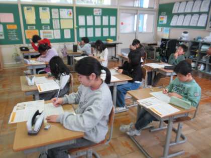 横書きの文字をどのように書いたらきれいになるかを考えて学習しました。中心の線に沿って書いたらよいか、下の線に沿って書いたらよいか、それぞれ練習してみて、自分はどちらが書きやすいか考えました。