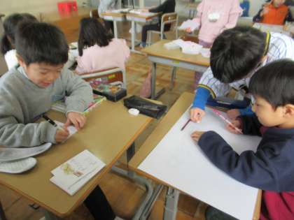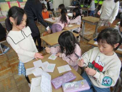 2月9日(金)国語の学習 公開日 2024/02/09 更新日 2024/02/09 1年生 1年生体験入学の準備をしています。来年度の1年生と一緒に楽しむために「お店屋さんごっこ」の準備をしました。お店の看板や商品カードをていねいにかわいらしく仕上げています。みんなで一緒におべんきょうするのを、とても楽しみにしています。