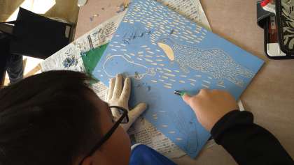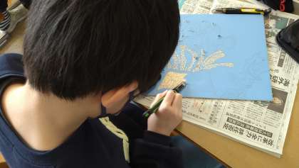 2月14日(水) 5年生 図画工作科の学習 公開日 2024/02/14 更新日 2024/02/14 5年生 集中して取り組んでいます。色をつけたいところ、黒いインクを残すところをイメージしながら、彫り進めました。