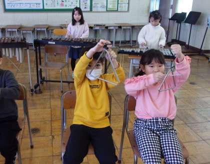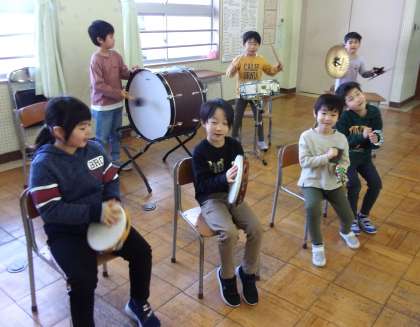 音楽科の学習で鑑賞した「ラデツキー行進曲」を、いろいろな楽器や体を使って合奏しています。「聴いて合わせる」を合い言葉に、伴奏や他の楽器の音を聴きながら、自分のパートを奏でています。繰り返しの旋律やリズムの面白さを味わいながら、友達と音を重ねることを楽しんでいます。全員の演奏パートを把握し、的確に指示する指揮者のおかげで、音が一つにまとまってきました。楽しく軽快な音色と笑顔がはずんでいます。