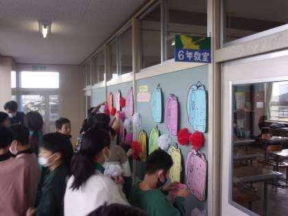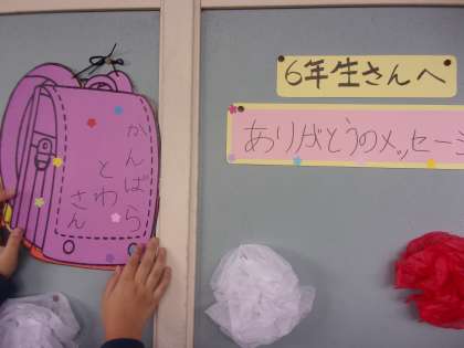 6年生が特別教室で授業をしている間に、こっそりと廊下に卒業を祝う飾りを掲示しました。ランドセルの掲示を開くと、全校児童から6年生一人一人へのメッセージが書かれています。
