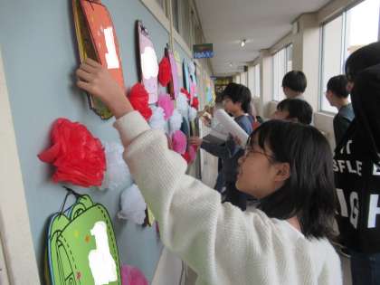 1〜5年生が書いた卒業メッセージカードが、6年生教室前に掲示されました。「運動会のときに優しく教えてくれてありがとう」「中学校でもがんばってください」など、うれしいメッセージがたくさんあり、6年生は笑顔いっぱいになりました。在校生のみなさん、ありがとう!