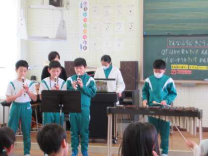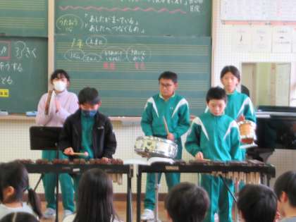 5年生の演奏を聴いた1年生は、思わず一緒になって手拍子をして楽しみました。