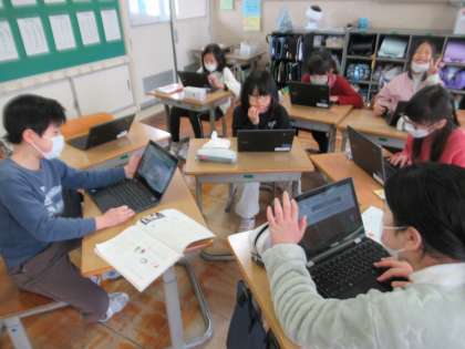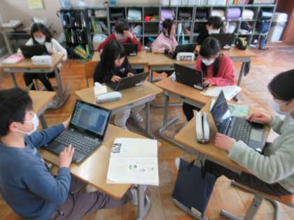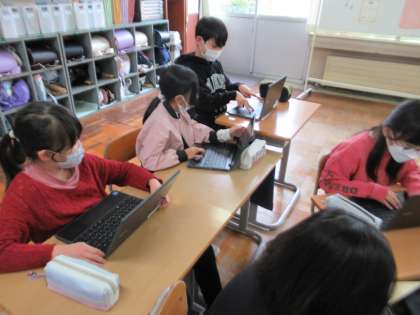3月1日(金)3年生 国語の学習 公開日 2024/03/01 更新日 2024/03/01 3年生 先日、地域の方から教えていただいたモニューマンのことについての紹介スライドを作っています。2グループに分かれて、「ここはこうした方がいいね」「私、こっちのページやるね」と、話し合いながら、すてきなスライドになるよう協力しあいました。