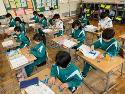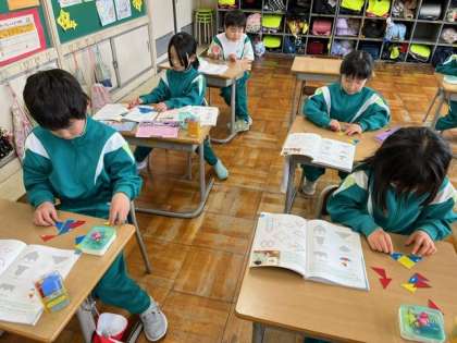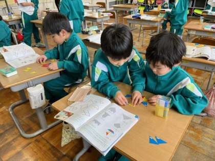 今日は図形の学習です。三角形のカードを組み合わせて、教科書に載っている形になるように考えました。