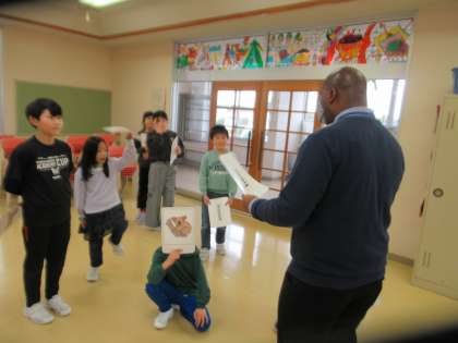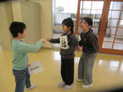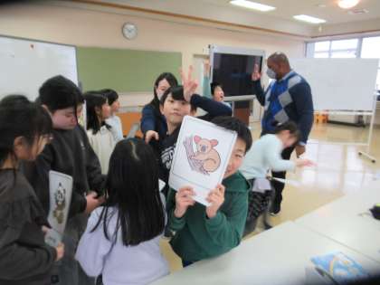 3月5日(火)3年生 外国語の学習 公開日 2024/03/06 更新日 2024/03/06 3年生 ALTの先生といっしょに、「Who am I?」の表現を使って学習をしました。動物のカードを使ってゲームをしながら楽しく学習をしました。
